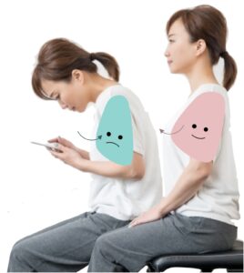 猫背になるとあばら骨がつぶれてしまい、あばら骨の内側にある肺が広がらなくなってしまいます。