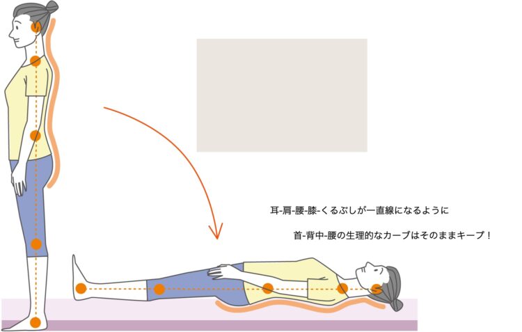 基本的な考え方としては、まっすぐに立った良い姿勢が、そのまま寝た姿勢になることが理想です。