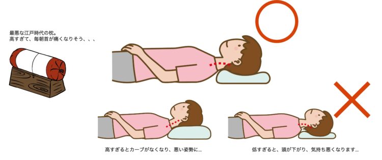 高すぎる枕は頸椎を過度に伸ばし、低すぎる枕は頸椎を曲げたままにしてしまうため、