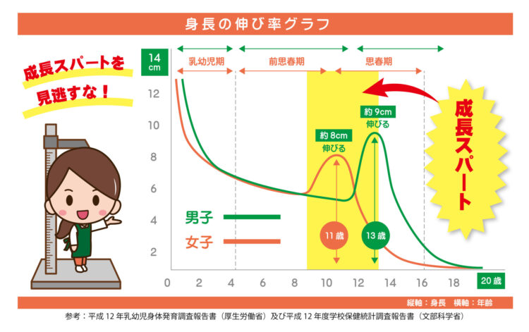 身長が急激に伸びる時期を「成長スパート」と呼びますが、これには2つの大きな波があります。
