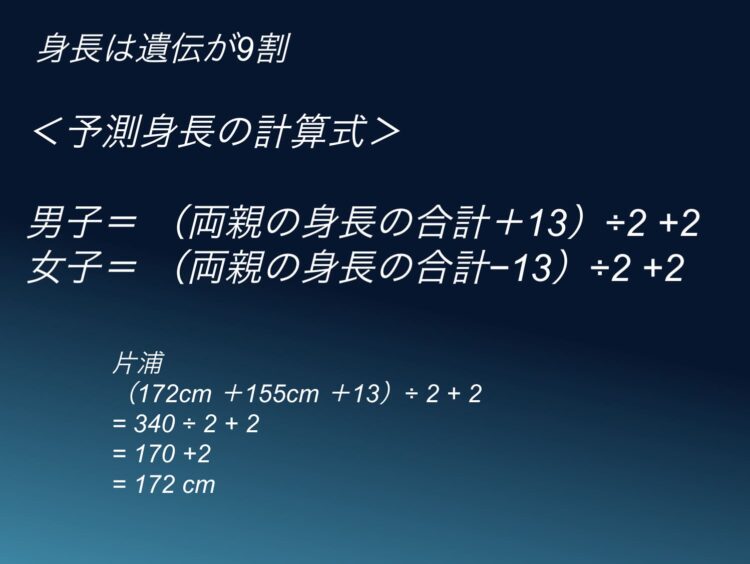 - 女子:(両親の身長の合計 - 13)÷ 2 + 2
