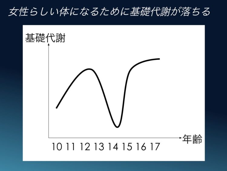 基礎代謝(何もしなくても消費されるエネルギー量)が一時的にガクッと落ちる時期(13〜14歳くらい)があるため、今までと同じ感覚でいると体が重く感じることがあります。