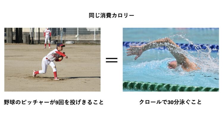一般的に、「クロールで30分泳ぐこと」と「野球のピッチャーが9回を投げきること」の消費カロリーはほぼ同じだと言われています。
