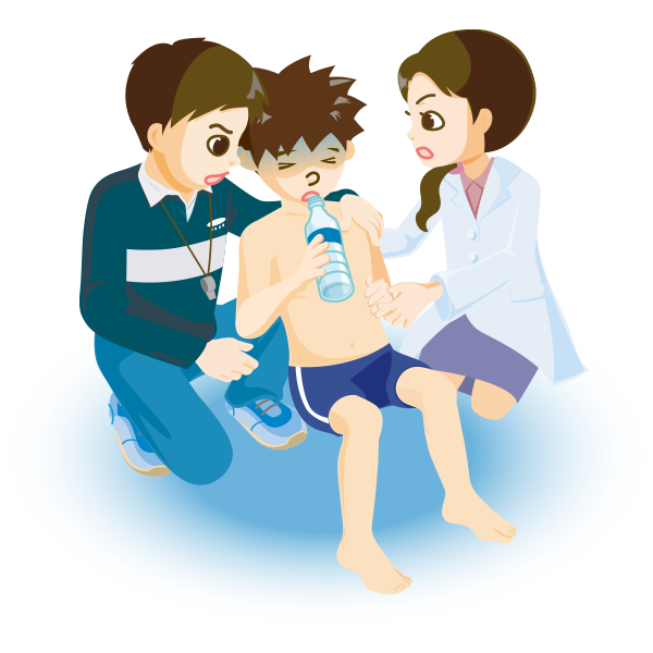 冷却(外部・内部): 意識がある場合は、涼しい場所へ移動し、首、脇の下、太ももの付け根など太い血管がある場所を氷で冷やします。冷えたスポーツドリンクを少しずつ飲ませるのも有効です。