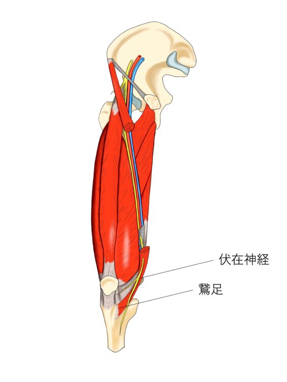 伏在神経は鵞足(薄筋・縫工筋・半腱様筋)のすぐ近くを走るため、
