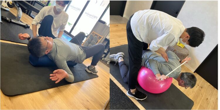 まずは、ストレッチポールと呼ばれる道具で肩甲骨を正しく寄せる練習をしてから、